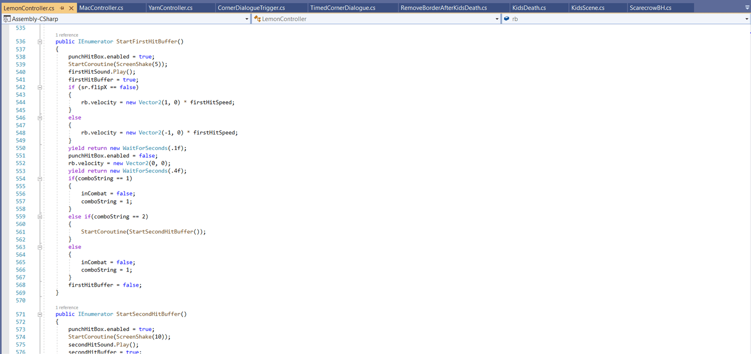 We split the gameplay programming among the 3 coders on our team. For example, I’m responsible for the movement controllers, Mac’s abilities, Lemon’s abilities, and shooting in the bullet hell.